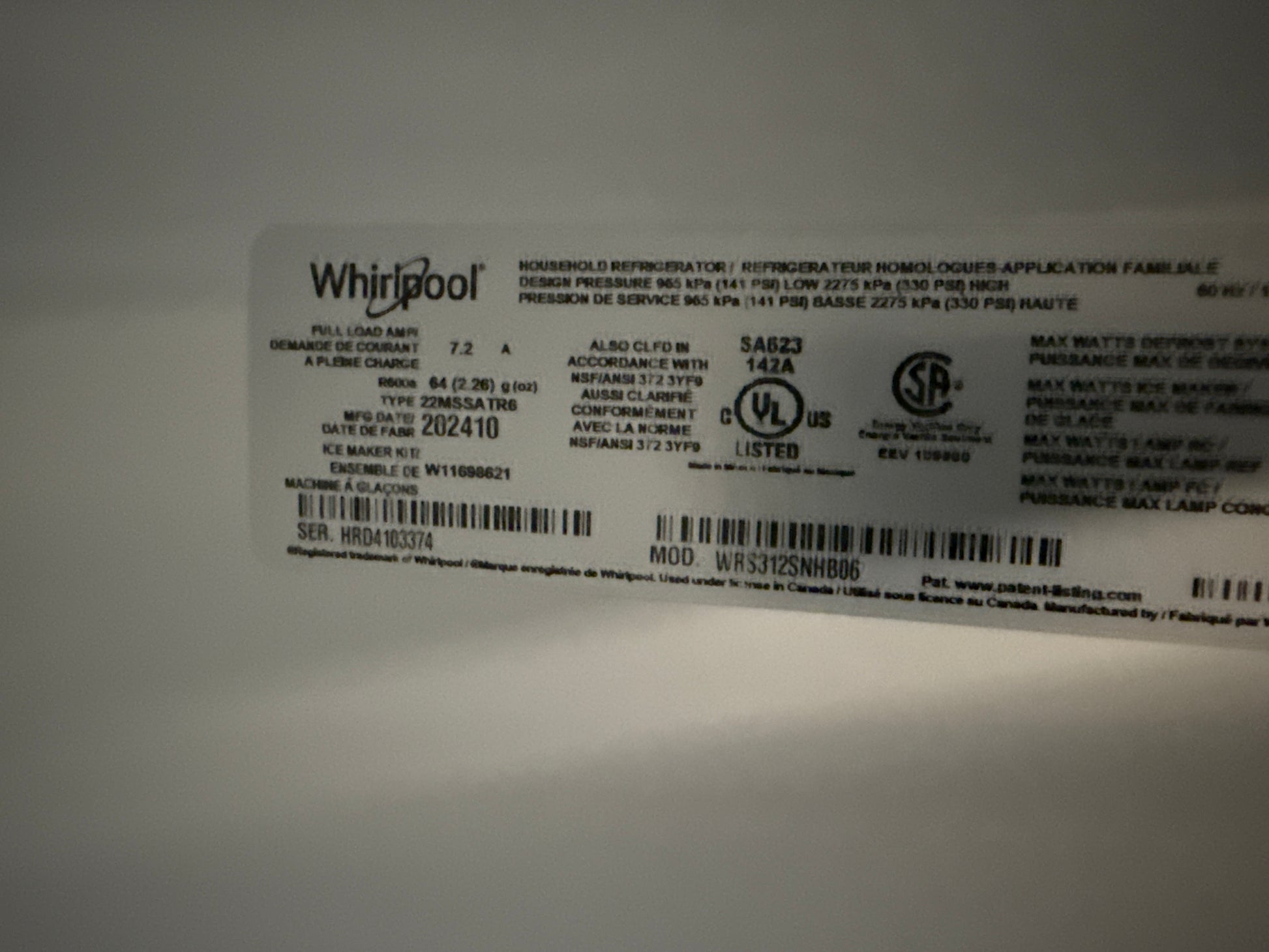 Réfrigérateur côte à côte 21,7 pi³ 33 po de Whirlpool (WRS312SNHB)- NOIRE