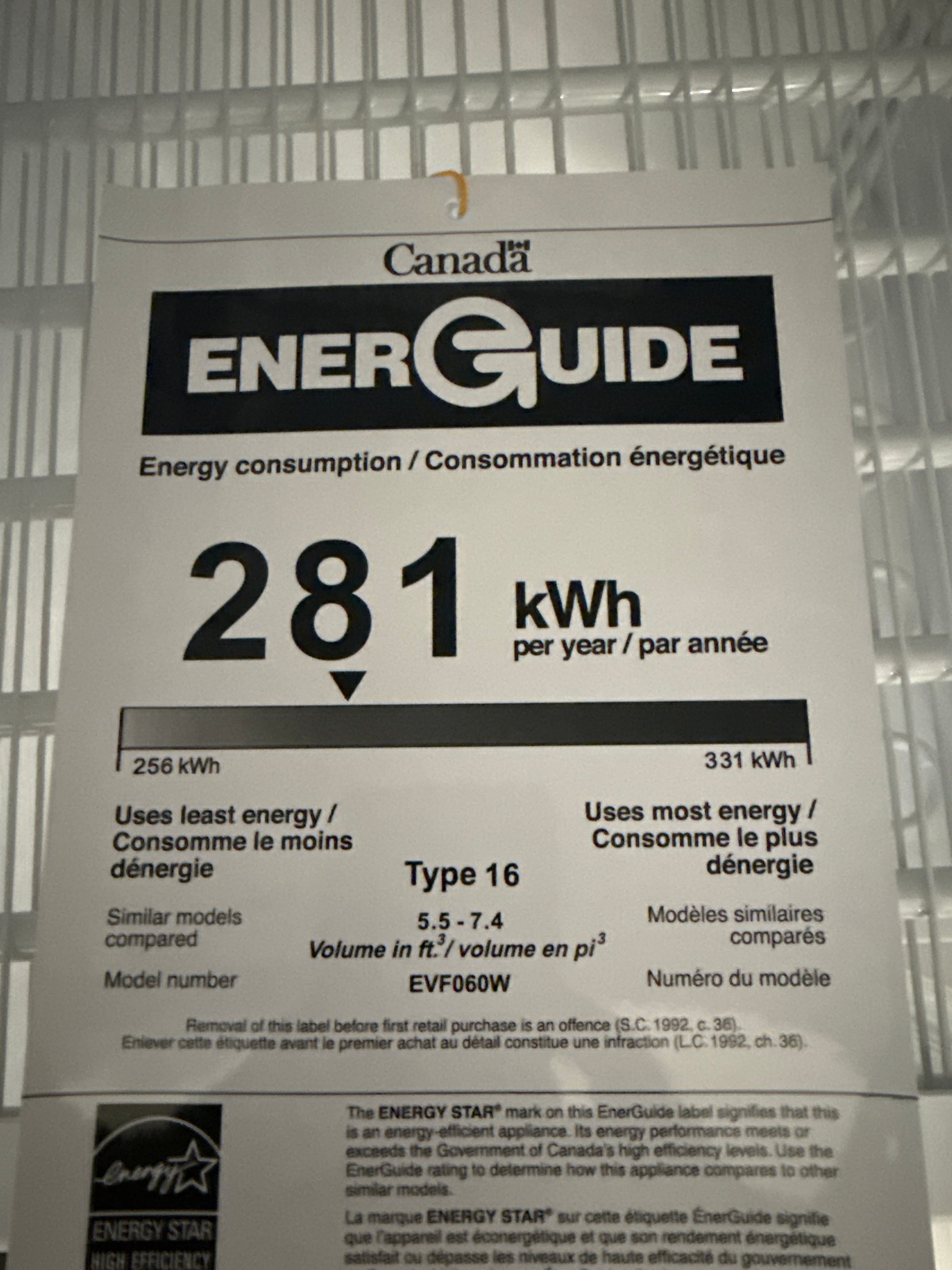 Congélateur Colonne de congélation 6 Pi. cu. Modèle# EVF060W