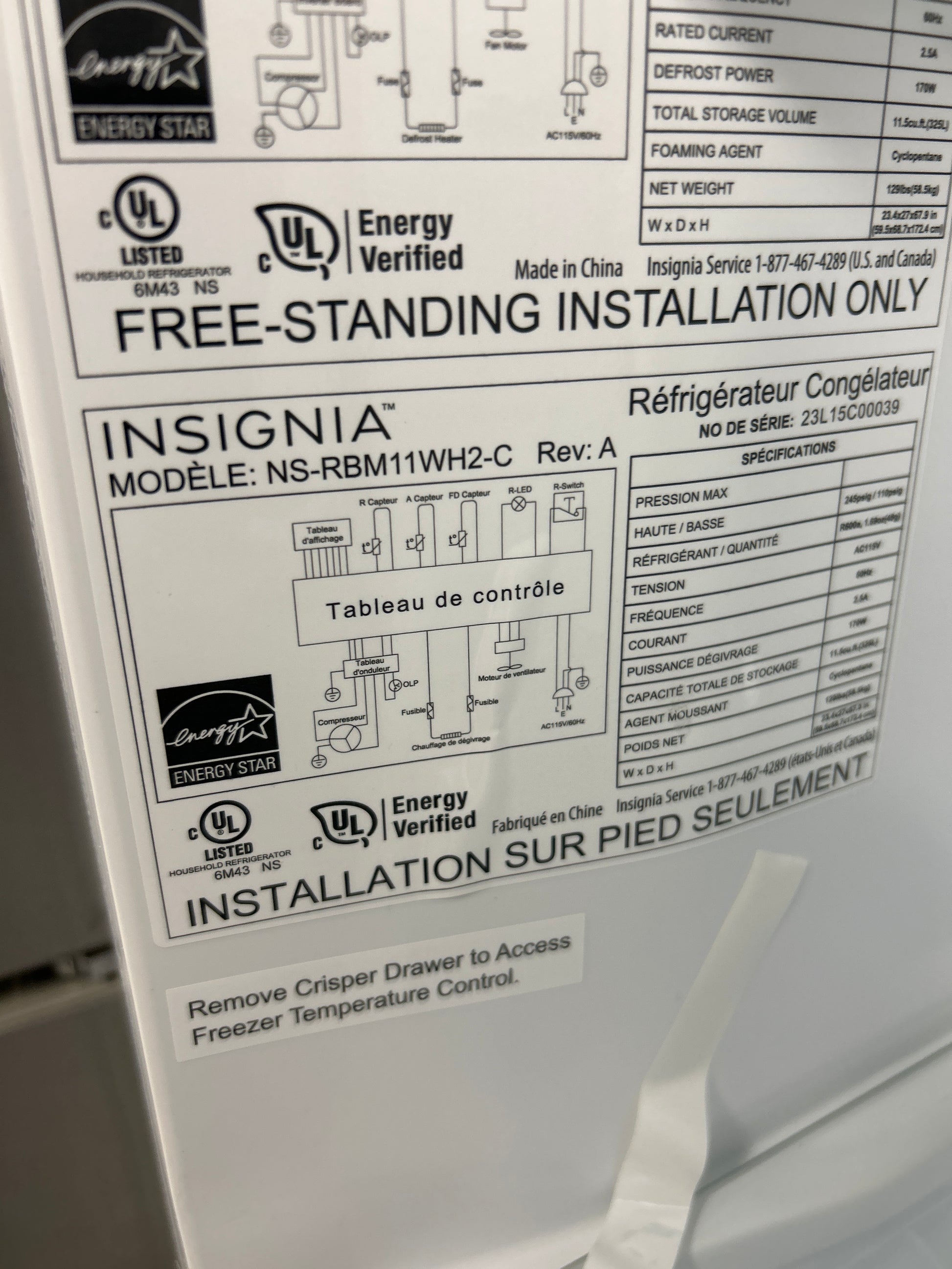 Réfrigérateur à congélateur inférieur 11,5 pi³ 24 po d'Insignia (NS-RBM11WH2-C) - Blanc